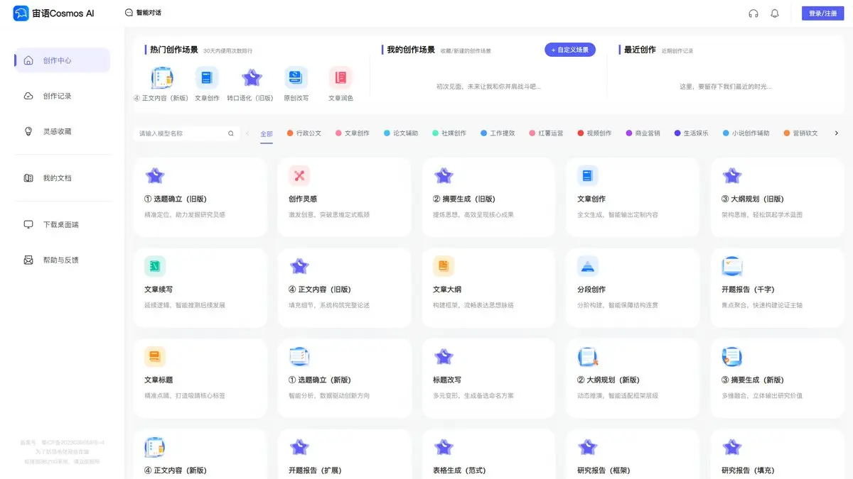 宙语AI包含了创作灵感、文章创作、重点总结、文章标题、文章续写、文本纠错、原创改写、文章润色、文章提炼、文案扩写、文章点评和相似度计算等12个模型,实现了从创意到成稿的完整写作流程。