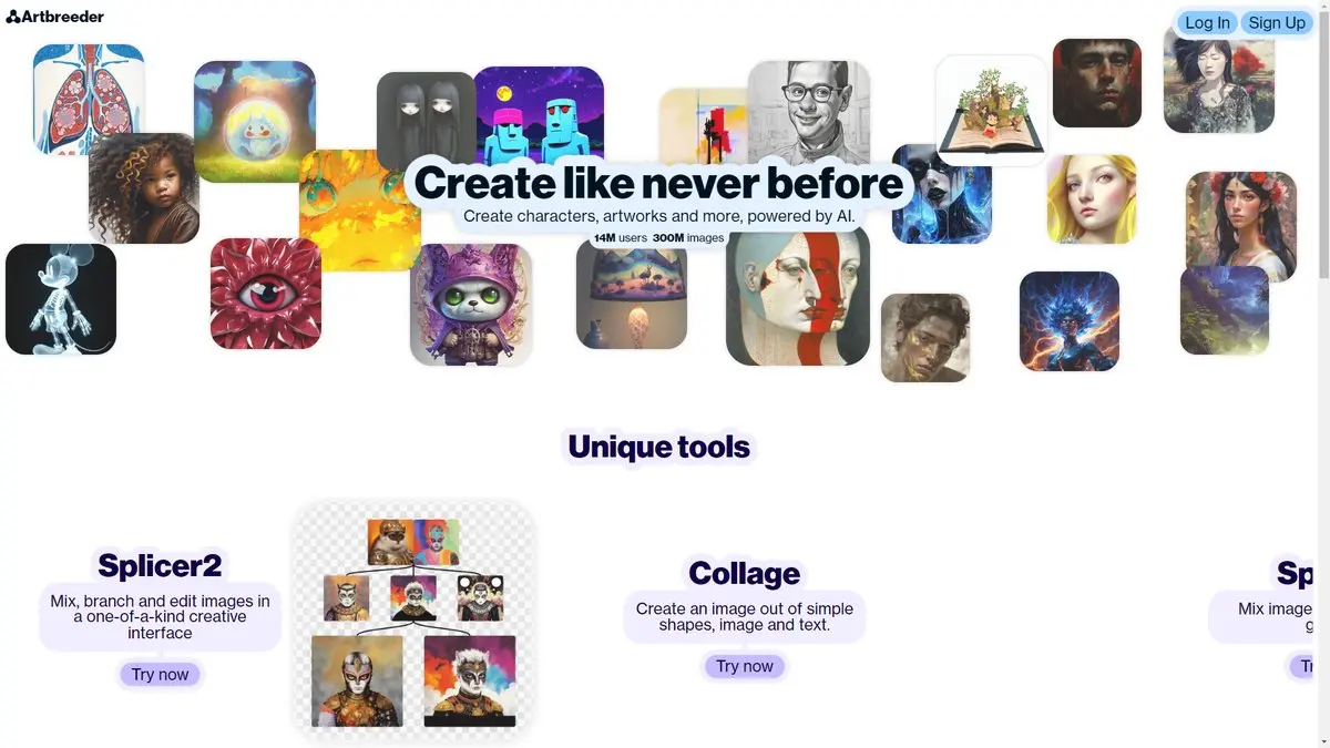 界面设计与操作流程 Artbreeder采用直观的用户界面设计,简化了复杂的过程,使各种技能水平的艺术家都能轻松使用。主页显示Splicer和Collage两个主要选项,用户可以根据需求选择不同的创作模式。