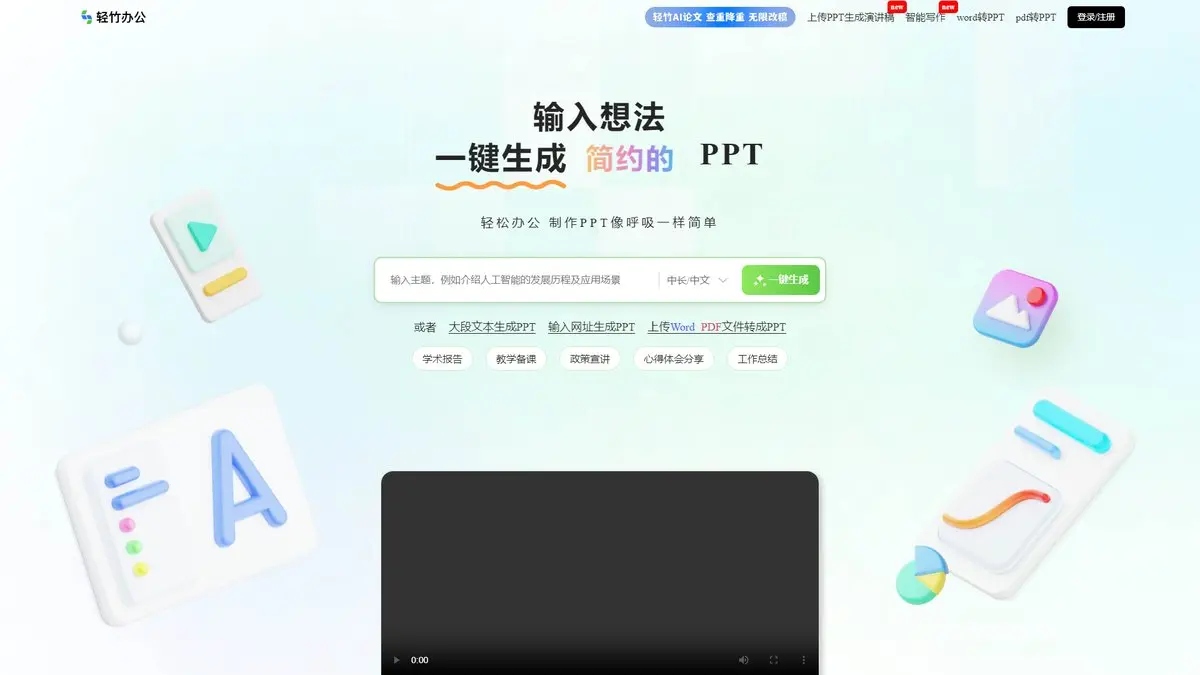 AI一键生成PPT 轻竹办公的核心功能是AI驱动的内容生成。用户只需在输入框中输入PPT主题,AI将在几十秒内自动生成包含封面页、目录页、章节页、正文页和结束页的完整演示文稿框架。该功能基于清华智谱AI模型,通过自然语言处理技术解析用户输入,自动生成逻辑严谨的内容提纲,并结合深度学习算法智能匹配设计模板。