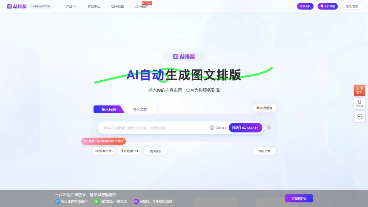 135 AI排版界面简洁明了,操作流程十分简单。用户只需按照提示输入主题和内容,即可快速生成排版方案。相比复杂的专业设计软件,该工具显著降低了使用门槛。