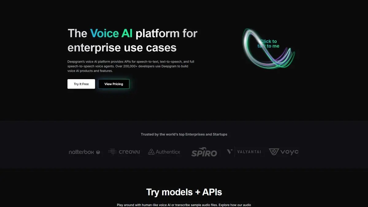 高性能企业级语音AI平台,提供快速准确的语音转文本、文本转语音和语音代理API,以端到端深度学习技术实现低延迟、高性价比的语音处理服务