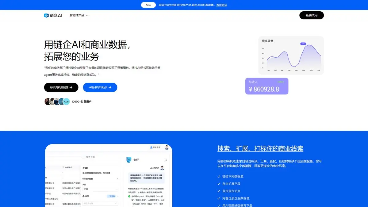 链企AI是国内首个专业的AI商业搜索和标讯服务平台,致力于为企业和商业从业者提供智能化的商业信息查询和分析服务。该平台基于千亿参数的企业知识领域自研大模型,聚合了3万亿Token的全人类商业知识和1.8亿+条实时招投标信息,通过自然语言处理和深度学习技术,为用户提供企业查询、行业分析、商机挖掘和AI标书写作等核心功能。