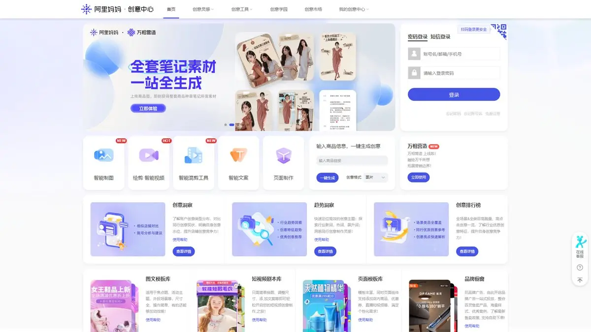 平台采用简洁直观的界面设计,主要功能模块分布清晰。操作流程遵循”输入-生成-编辑-导出”的简化逻辑,即使是营销新手也能快速上手。整体界面风格与阿里系产品保持一致,学习成本较低。
