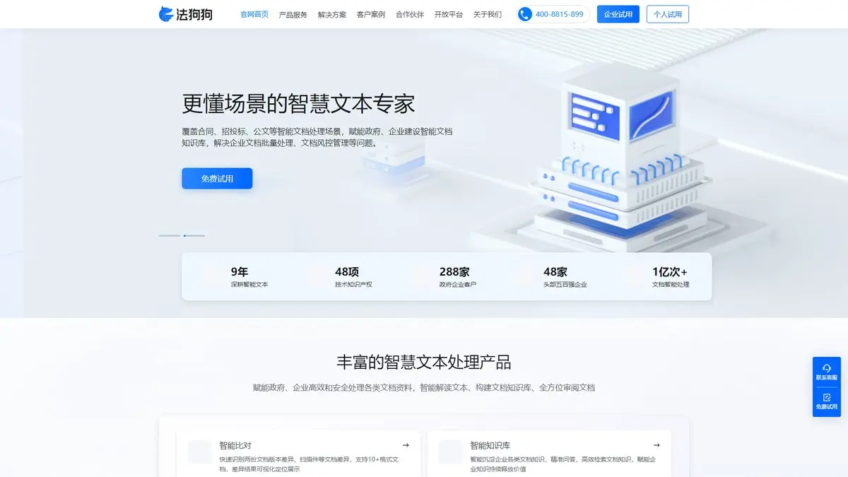 法狗狗是深耕智能文本处理9年的”人工智能+法律”领先企业,从法律AI先锋成功转型为智能文档处理专家。基于自研NLP、OCR、知识图谱等核心技术,为600家政企客户提供合同审查、招投标、公文处理等场景的智能文档解决方案。拥有100项技术专利,处理文档超1亿次,管理效率提升70%,风险拦截率>98%,是政企客户数字化转型的可靠伙伴。