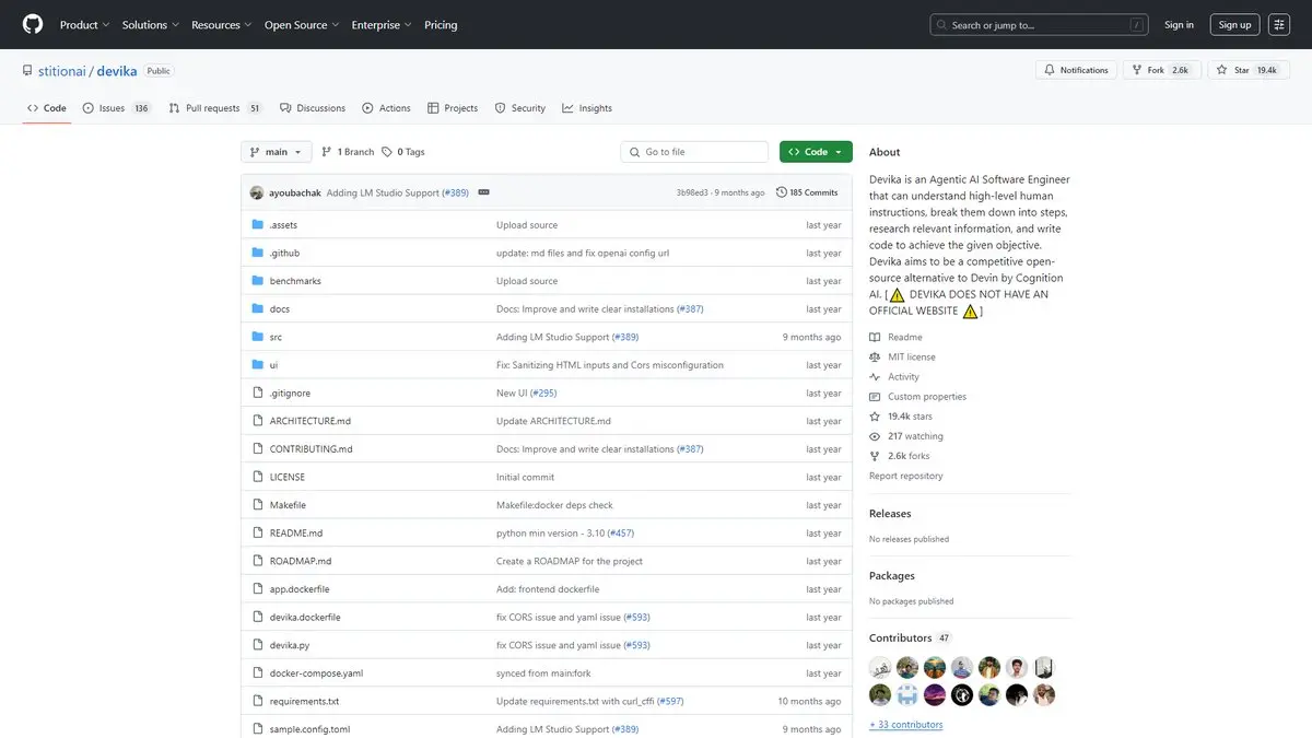 项目在GitHub上已获得19.3k星标,采用MIT许可证发布,体现了其开源协作的理念。值得注意的是,Devika目前没有官方网站,所有开发活动都集中在GitHub平台上。